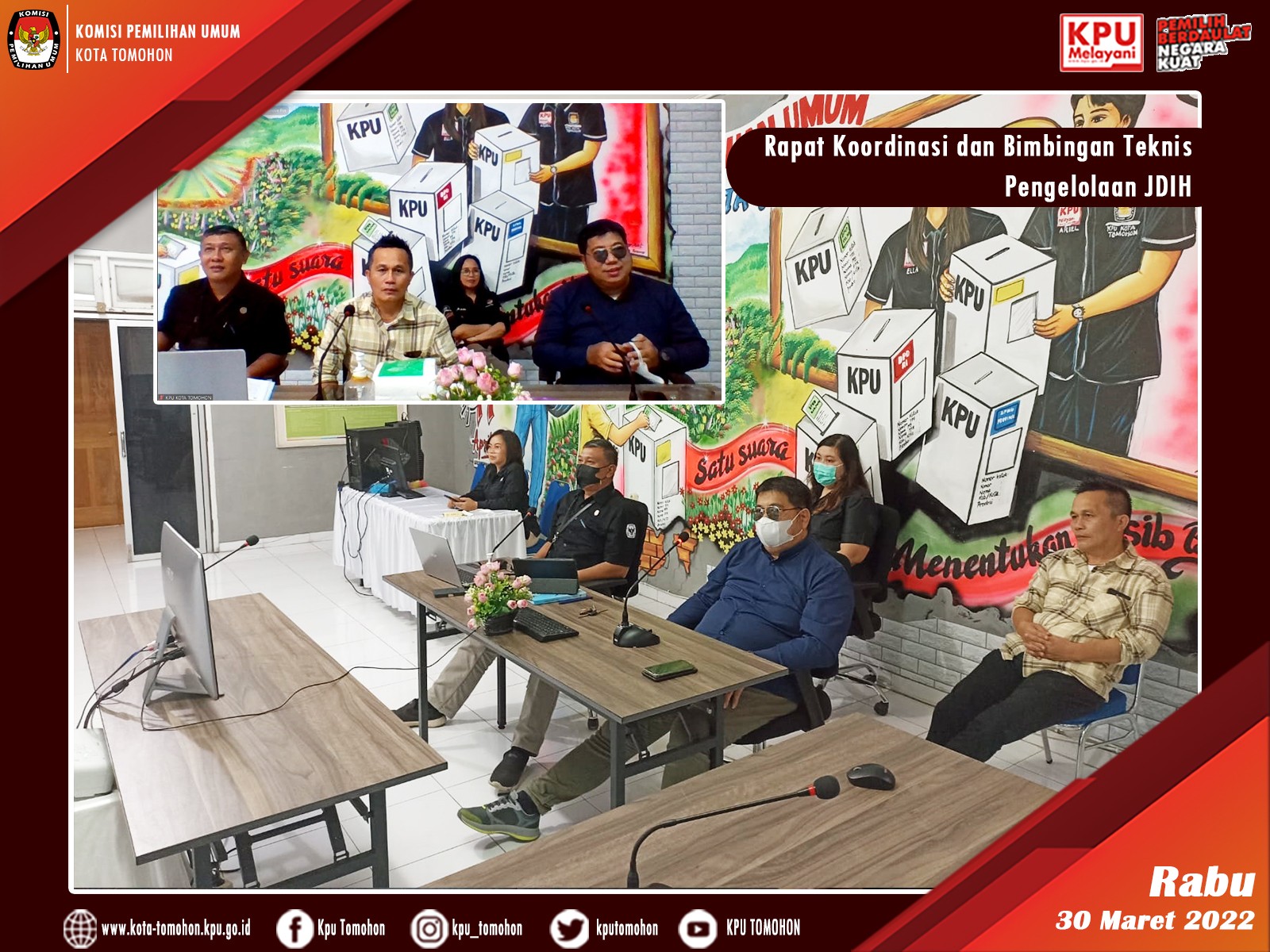 Tomohon, kota-tomohon.kpu.go.id - KPU Kota Tomohon mengikuti Rapat Koordinasi dan Bimbingan Teknis Pengelolaan JDIH bersama 15 kabupaten/kota se Provinsi Sulawesi Utara. Kegiatan ini diselenggarakan oleh KPU Provinsi Sulawesi Utara melalui aplikasi Zoom Meeting. Kegiatan ini mengundang Ketua Divisi Hukum dan Pengawasan, Kasubbag Hukum dan SDM, dan Operator/Admin JDIH (30/03.