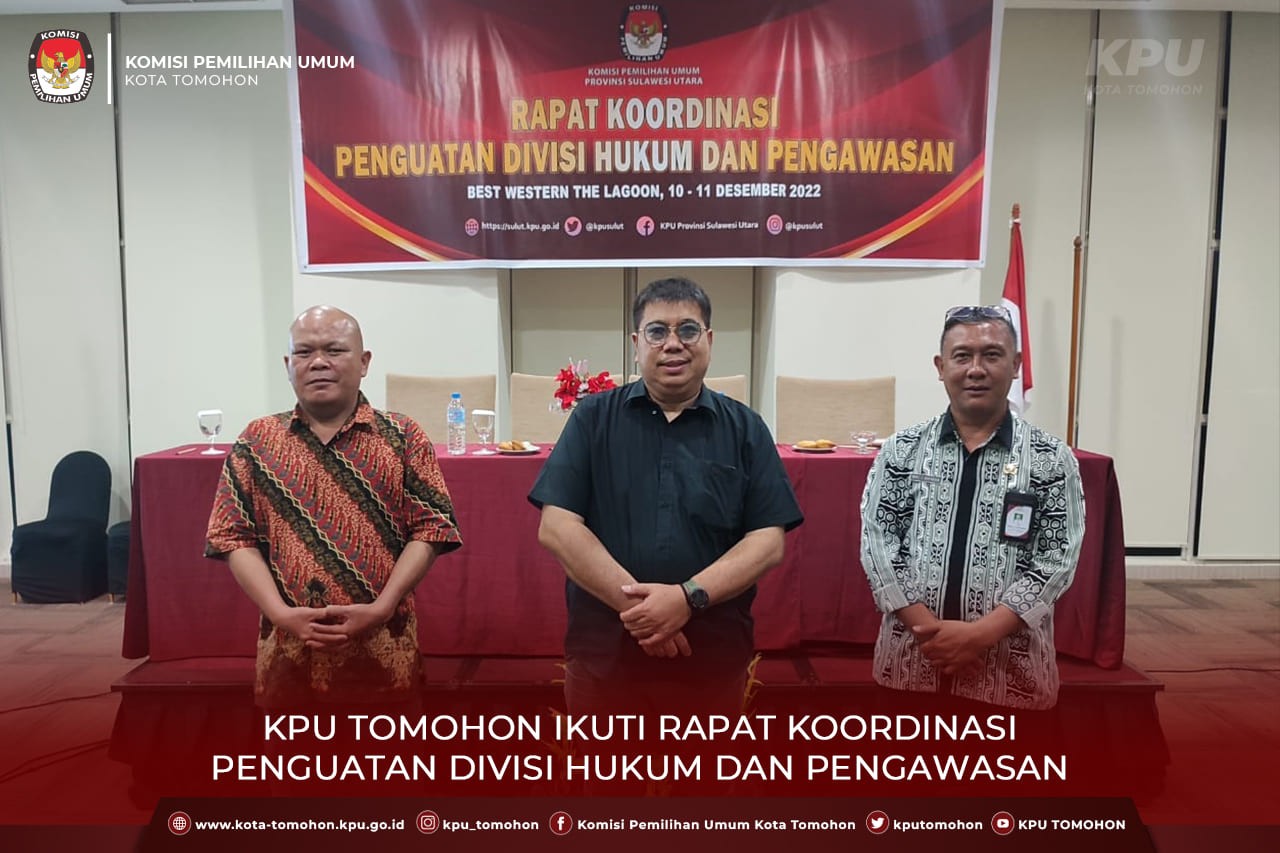 Tomohon, kota-tomohon.kpu.go.id - Kadiv Hukum dan Pengawasan, Kasubbag Hukum dan SDM beserta Staf Pelaksana Sub Bagian Hukum menghadiri Rapat Koordinasi Penguatan Divisi Hukum dan Pengawasan, yang diselenggarakan KPU Provinsi Sulawesi Utara, bertempat di Best Western The Lagoon Manado, Sabtu-Minggu, 10 s.d 11 Desember 2022. Rakor dibuka oleh Ketua KPU Provinsi Sulawesi Utara Meidy Tinangon.