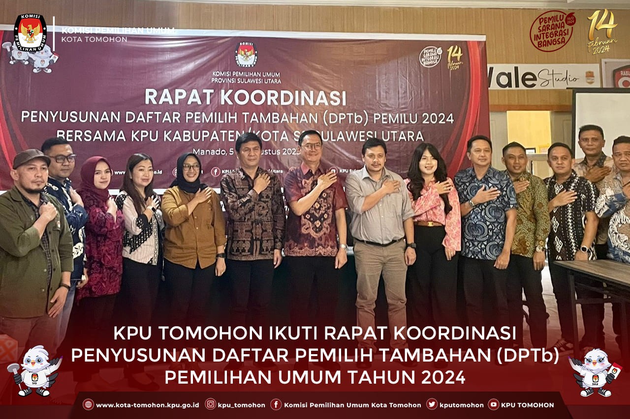 Tomohon, kota-tomohon.kpu.go.id - Dalam rangka melindungi hak setiap warga Negara tetap boleh menggunakan hak pilihnya pada saat Pemilu nanti maka KPU melaksanakan Rapat Koordinasi Penyusunan Daftar Pemilih Tambahan (DPTb) bersama KPU Kabupaten/Kota di kantor KPU Provinsi Sulawesi Utara tanggal 5-6 Agustus 2023. Rakor dihadiri oleh Anggota DKPP RI : M. Thio Aliansyah, Ketua Bawaslu Provinsi Sulawesi Utara Ardiles Mewoh, Komisioner KPU Provinsi Sulawesi Utara, Tim Pusdatin KPU RI (melalui zoom), Ketua Divisi Perencanaan Data dan Informasi Kab/kota bersama Operator Sistem Informasi Data Pemilih (Sidalih).