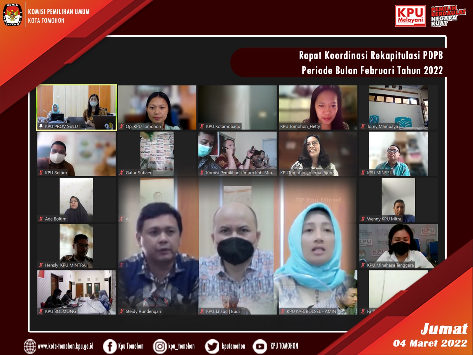 Tomohon, kota-tomohon.kpu.go.id - Kadiv Perencanaan, Data dan Informasi, Kasubbag Program dan Data, serta Operator Sidalih menghadiri undangan Rapat Koordinasi Rekapitulasi Pemutakhiran Data Pemilih Berkelanjutan Periode Periode Bulan Februari Tahun 2022 melalui aplikasi Zoom Meeting yang diselenggarakan oleh KPU Provinsi Sulawesi Utara (04/03).