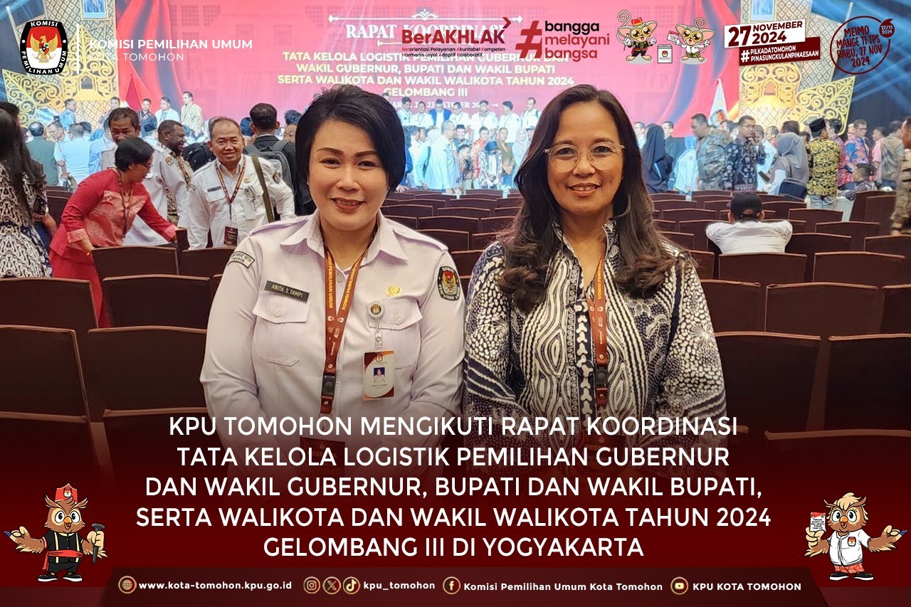 Tomohon, kota-tomohon.kpu.go.id - Ketua KPU Kota Tomohon Albertien G. V. Pijoh bersama Sekretaris Anita S. Tampi mengikuti Rapat Koordinasi Tata Kelola Logistik Pemilihan Gubernur dan Wakil Gubernur, Bupati dan Wakil Bupati serta Walikota dan Wakil Walikota Tahun 2024 Gelombang III, di Yogayakarta 21 s.d 23 Oktober 2024.