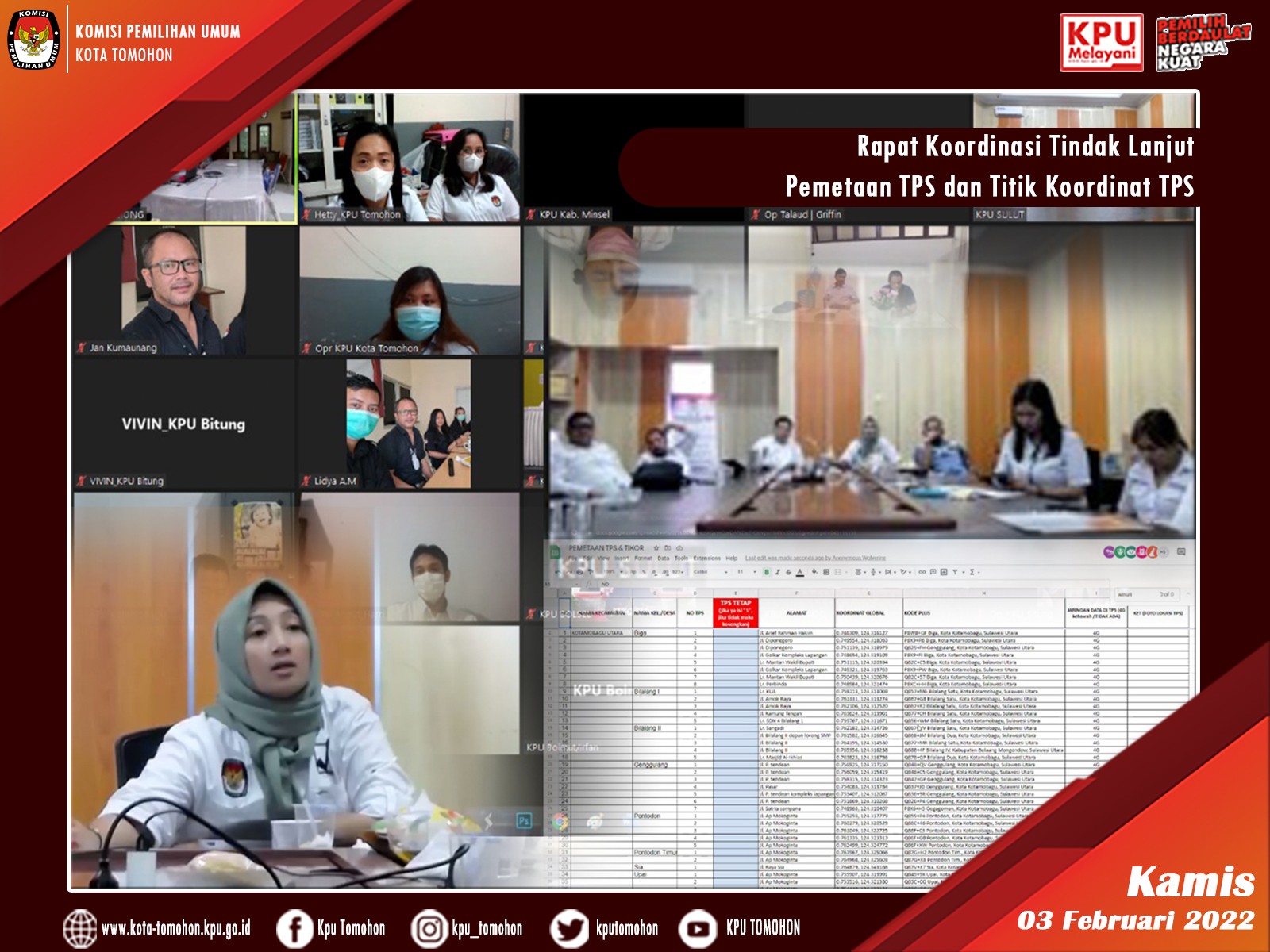 Tomohon, kota-tomohon.kpu.go.id - Kadiv Perencanaan Data dan Informasi, Kasubbag Program dan Data, serta Operator Sidalih KPU Kota Tomohon mengikuti Rapat Koordinasi Tindak Lanjut Pemetaan TPS dan Titik Koordinat TPS secara daring melalui aplikasi Zoom Meeting yang diselenggarakan KPU Provinsi Sulawesi Utara (03/02).