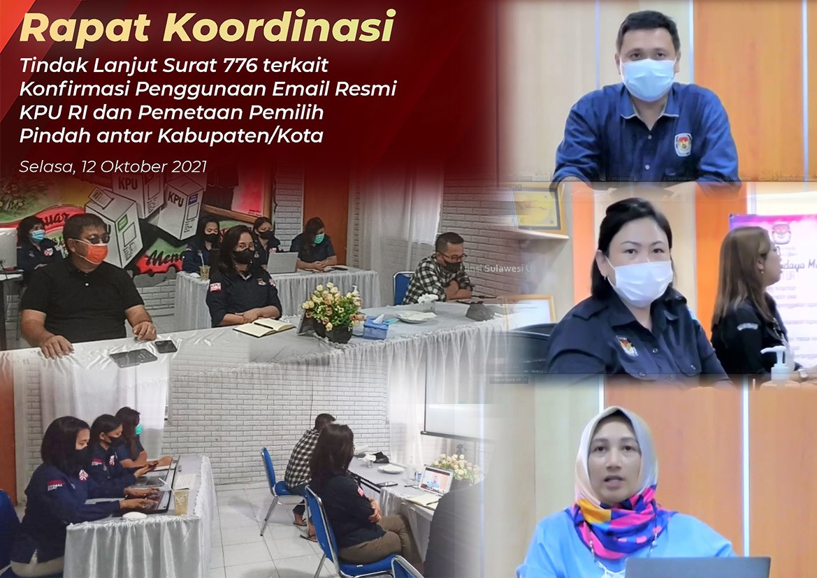 Tomohon, 12 Oktober 2021. Menindaklanjuti surat 776 terkait Konfirmasi Penggunaan Email Resmi KPU RI dan Pemetaan Pemilih Pindah antar Kabupaten/Kota, Komisi Pemilihan Umum Provinsi Sulawesi Utara mengadakan Rapat Koordinasi dengan seluruh KPU Kabupaten/Kota di lingkungan Provinsi Sulawesi Utara melalui aplikasi Zoom Meeting. Kegiatan ini diikuti oleh Ketua KPU Tomohon Harryanto Lasut, Kadiv Perencanaan, Data dan Informasi Albertien Pijoh, Sekretaris KPU Tomohon Stella Sompe, Kasubbag Progam dan Data Hetty Kabi, dan Operator Sidalih Prisca Lombogia. Kegiatan dibuka oleh Ketua KPU Provinsi Sulawesi Utara Ardiles Mewoh, dilanjutkan dengan arahan dari Kadiv Teknis Penyelenggara Yessy Momongan.