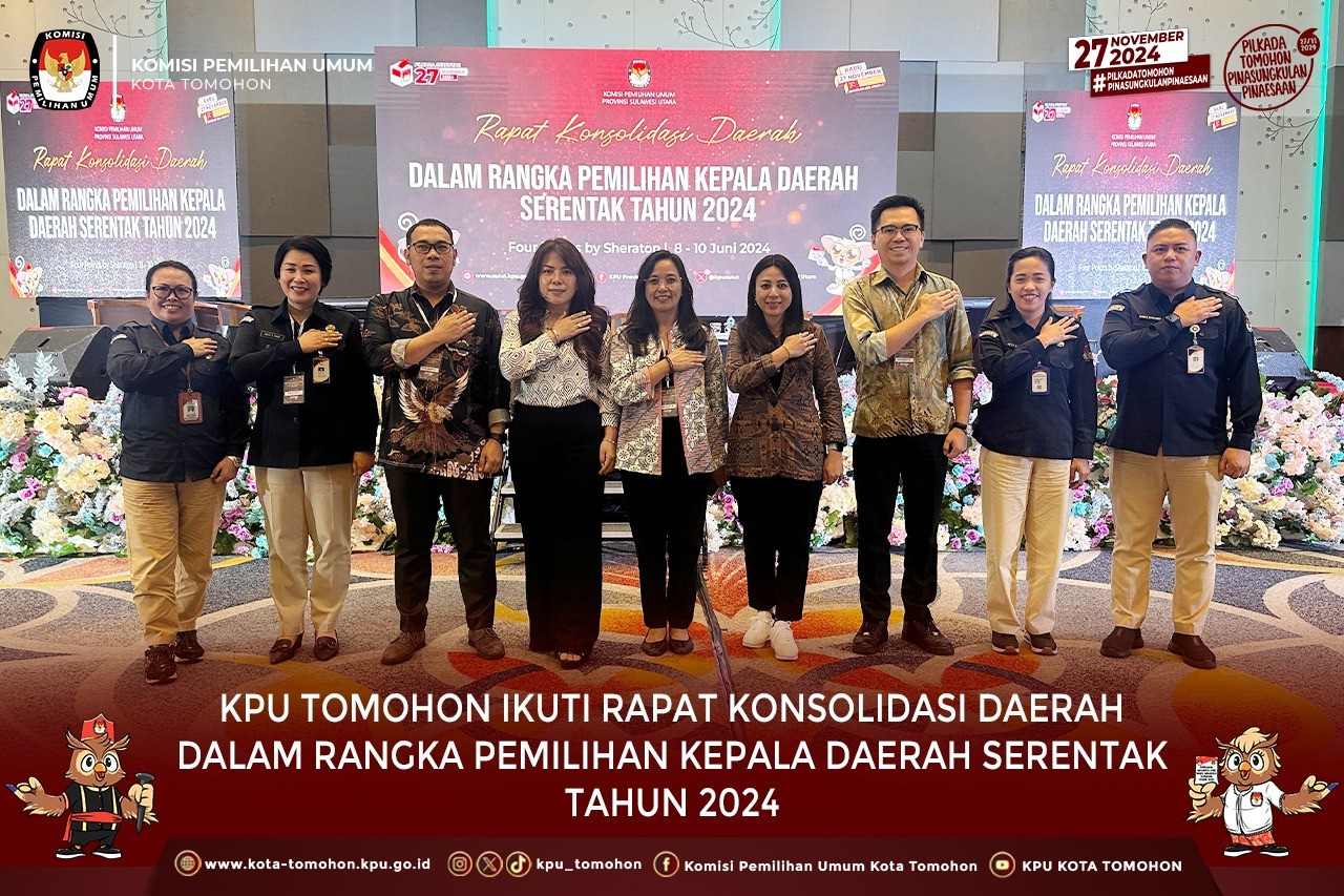 Tomohon, kota-tomohon.kpu.go.id - Komisi Pemilihan Umum (KPU) Kota Tomohon mengikuti kegiatan Rapat Konsolidasi Daerah dalam rangka Pemilihan Kepala Daerah Serentak Tahun 2024 yang diselenggarakan oleh KPU Provinsi Sulawesi Utara di Four Points by Sheraton Manado, Sabtu-Senin (8 s.d 10 Juni 2024).