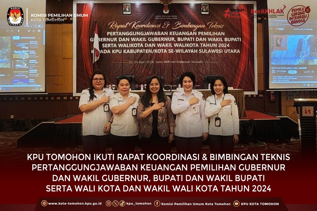 Tomohon, kota-tomohon.kpu.go.id - Komisi Pemilihan Umum (KPU) Kota Tomohon mengikuti Rapat Koordinasi dan Bimbingan Teknis Pertanggungjawaban Keuangan Pemilihan Gubernur dan Wakil Gubernur, Bupati dan Wakil Bupati serta Walikota dan Wakil Walikota Tahun 2024 bertempat di Hotel Swissbel Maleosan Manado, Senin s.d Rabu 22-24 April 2024.