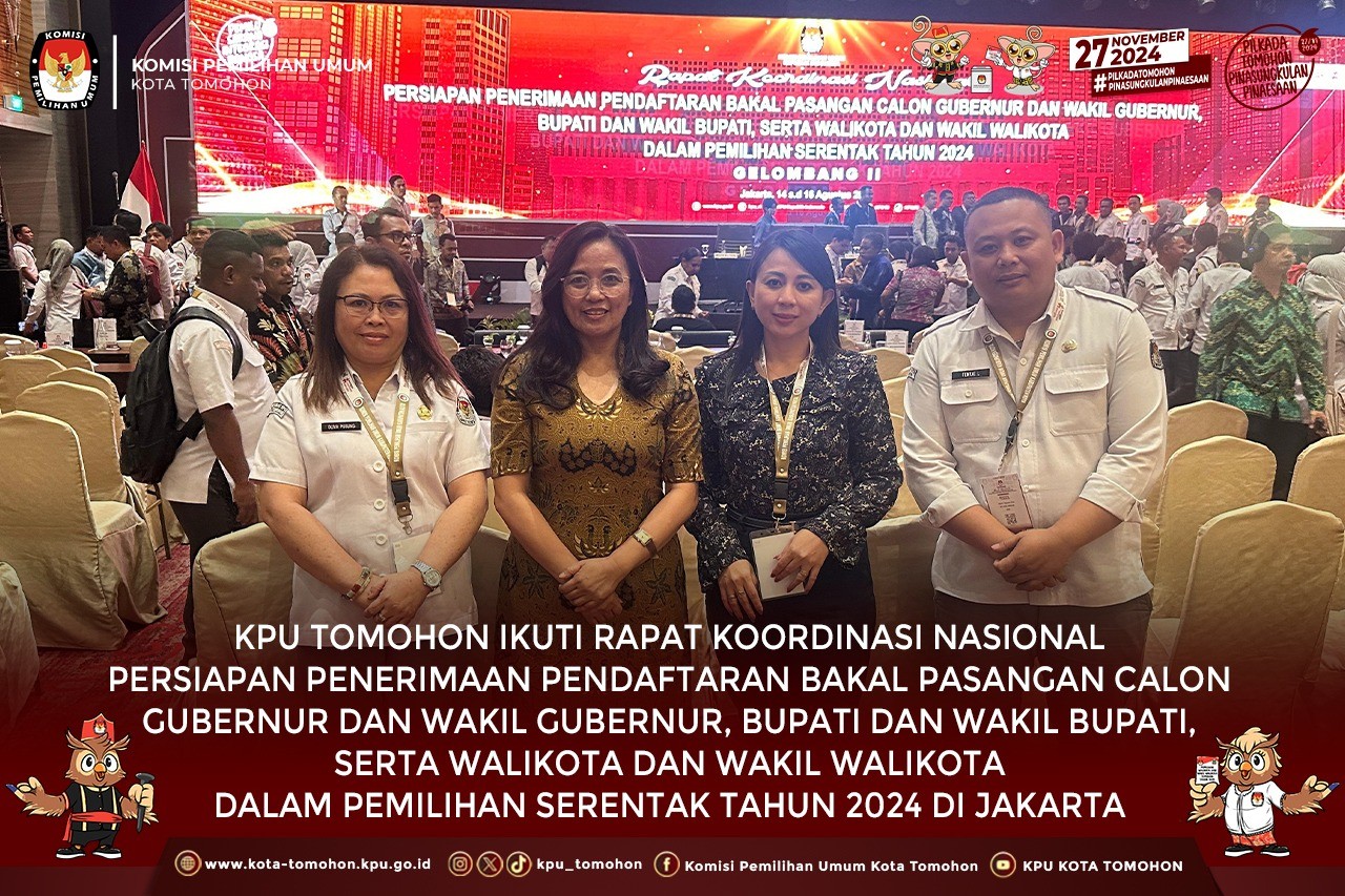 Tomohon, kota-tomohon.kpu.go.id - KPU Kota Tomohon mengikuti kegiatan Rapat Koordinasi Nasional Persiapan Penerimaan Pendaftaran Bakal Pasangan Calon Pemilihan Gubernur dan Wakil Gubernur, Bupati dan Wakil Bupati, serta Walikota dan Wakil Walikota di Jakarta, 14 s.d 16 Agustus 2024.