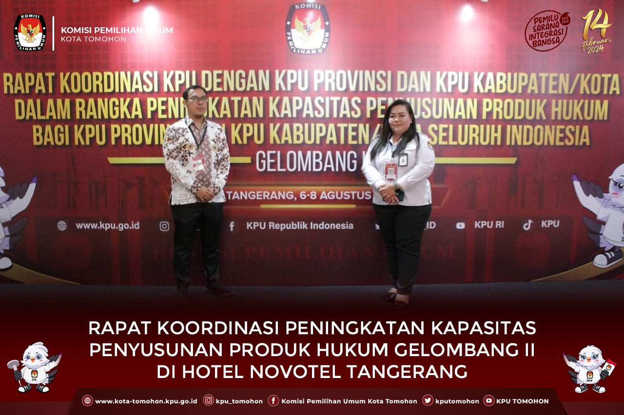 Tomohon, kota-tomohon.kpu.go.id – Sebagai upaya meningkatkan kapasitas penyusunan produk hukum, KPU RI melaksanakan Rapat Koordinasi KPU dengan KPU Provinsi dan KPU Kabupaten/Kota Dalam Rangka Peningkatan Kepasitas Penyusunan Produk Hukum Bagi KPU Provinsi dan KPU Kabupaten/Kota Seluruh Indonesia di Tangerang, Banten, 6-8 Agustus 2023 yang turut dihadiri oleh Ketua Divisi Hukum dan Pengawasan dan Kepala Sub Bagian Hukum dan SDM KPU Provinsi dan 15 Kabupaten/Kota se- Sulut.