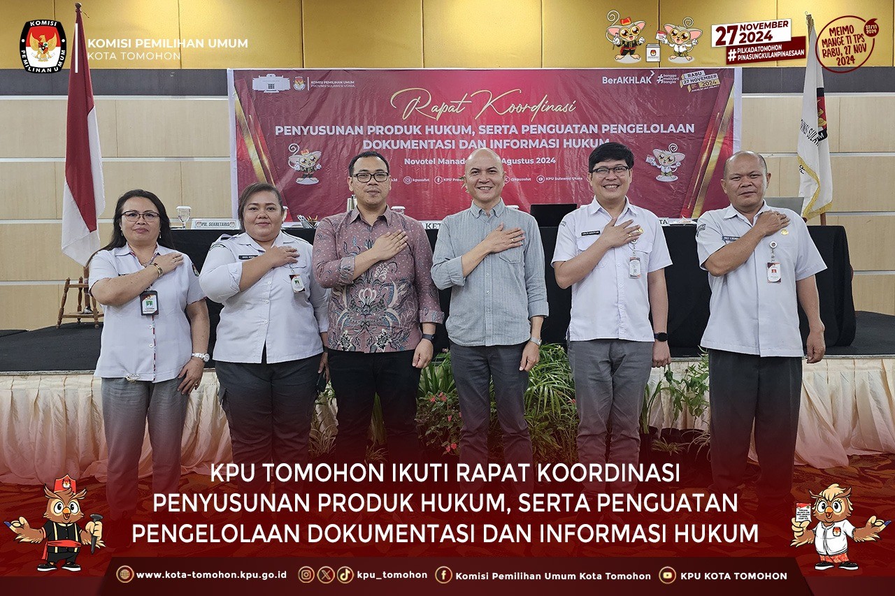 Tomohon, kota-tomohon.kpu.go.id - KPU Kota Tomohon mengikuti Rapat Koordinasi (Rakor) Penyusunan Produk Hukum dan Penguatan Pengelolaan Dokumentasi serta Informasi Hukum di Novotel Manado Golf Resort & Convention Center. Rakor ini berlangsung selama tiga hari, dimulai pada tanggal 22 hingga 24 Agustus 2024.