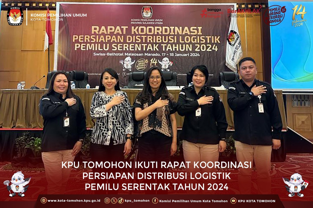 Tomohon, kota-tomohon.kpu.go.id - Komisi Pemilihan Umum (KPU) Kota Tomohon mengikuti Rapat Koordinasi Persiapan Distribusi Logistik Pemilu Serentak Tahun 2024 yang diselenggarakan oleh KPU Provinsi Sulawesi Utara, bertempat di Swiss-Belhotel Maleosan Manado yang berlangsung selama 2 (dua) hari, Rabu s.d Kamis, 17-18 Januari 2024.