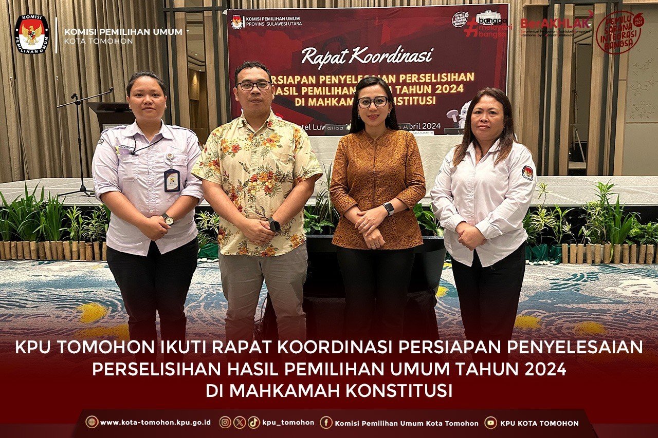 Tomohon, kota-tomohon.kpu.go.id - Ketua Divisi Hukum dan Pengawasan Youne Simangunsong bersama dengan Ketua Divisi Teknis Penyelenggaraan Deisy Soputan bersama dengan Kasubbag Teknis Penyelenggara Pemilu, Partisipasi dan Hubungan masyarakat Oliva Pusung dan staf mengikuti Pembukaan “Rapat Koordinasi Persiapan Penyelesaian Perselisihan Hasil Pemilihan Umum Tahun 2024 di Mahkamah Konstitusi” yang diselenggarakan oleh Komisi Pemilihan Umum Provinsi Sulawesi Utara di Luwansa Hotel & Convention Center Manado.