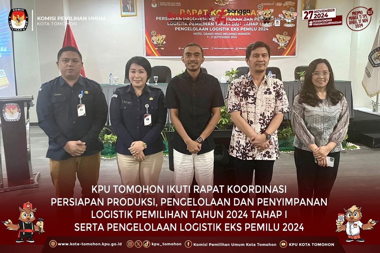 Tomohon, kota-tomohon.kpu.go.id - Ketua KPU Kota Tomohon Albertien G. V. Pijoh, Sekretaris Anita S. Tampi serta Kasub Keuangan, Umum dan Logistik Evans E. W. Tulungen mengikuti Rapat Koordinasi Persiapan Produksi, Pengelolaan dan Penyimpanan Logistik Pemilihan Tahun 2024 Tahap I serta Pengelolaan Logistik Eks Pemilu 2024, bertempat di Grand Whiz Hotel, 7 s.d 8 September 2024.