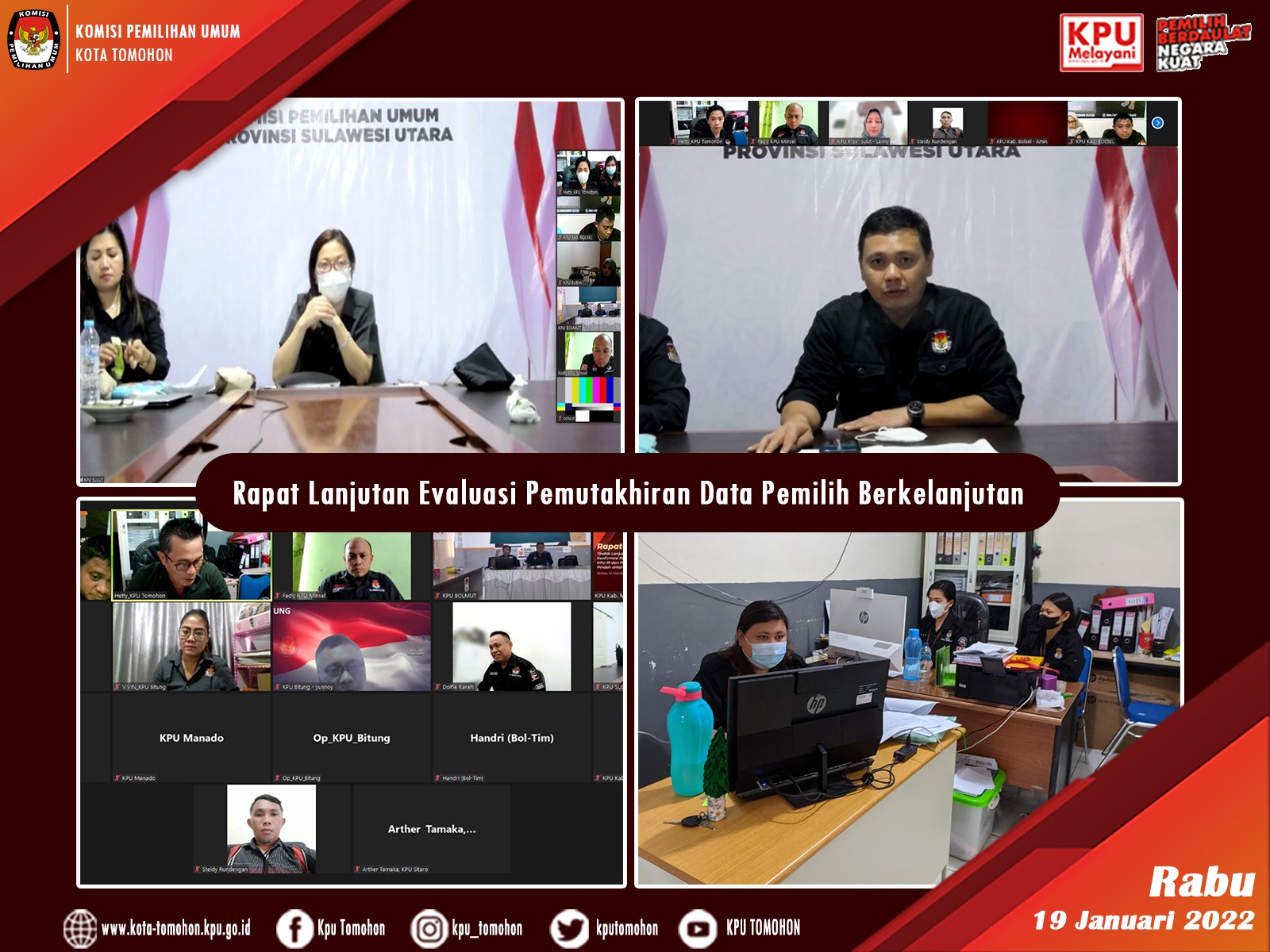 Tomohon, kota-tomohon.kpu.go.id - KPU Kota Tomohon mengikuti Rapat Lanjutan Evaluasi Pemutakhiran Data Pemilih Berkelanjutan yang dilaksanakan oleh KPU Provinsi Sulawesi Utara Secara daring (19/01). Pada kegiatan ini, masing-masing kabupaten/kota se Provinsi Sulawesi Utara mempresentasikan materi sesuai yang disampaikan dalam surat undangan yaitu Laporan PDPB Tahun 2021, Grafik PDPB Tahun 2021, Laporan Progres Migrasi Website, Data Operator Sidalih yang Aktif.