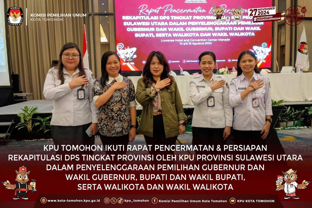 Tomohon, kota-tomohon.kpu.go.id - KPU Kota Tomohon bersama Operator Disdukcapil Kota Tomohon mengikuti Rapat Pencermatan & Persiapan Rekapitulasi DPS Tingkat Provinsi Sulawesi Utara dalam Penyelenggaraan Pemilihan Gubernur dan Wakil Gubernur, Bupati dan Wakil Bupati, serta Walikota dan Wakil Walikota yang diselenggarakan oleh KPU Provinsi Sulawesi Utara, bertempat di Luwansa Hotel Manado, 14 s.d 15 Agustus 2024.