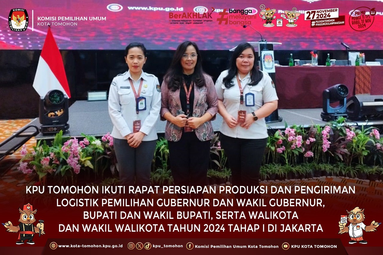 Tomohon, kota-tomohon.kpu.go.id - Komisi Pemilihan Umum (KPU) Kota Tomohon mengikuti Rapat Persiapan Produksi dan Pengiriman Logistik Pemilihan Gubernur dan Wakil Gubernur, Bupati dan Wakil Bupati, serta Walikota dan Wakil Walikota Tahun 2024 Tahap I tanggal 1 s.d 6 September 2024 di Jakarta.
