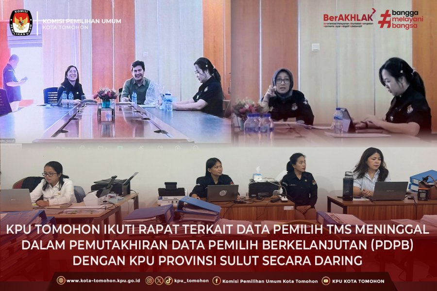 Tomohon, kota-tomohon.kpu.go.id - KPU Kota Tomohon mengikuti rapat secara daring bersama KPU Provinsi Sulawesi Utara pada Rabu (9/7/2025), dalam rangka membahas data pemilih Tidak Memenuhi Syarat (TMS) karena meninggal dunia dalam tahapan Pemutakhiran Data Pemilih Berkelanjutan (PDPB) Tahun 2025.