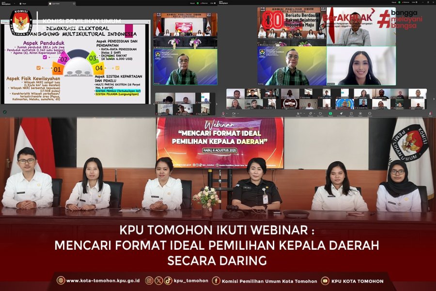 Tomohon, kota-tomohon.kpu.go.id - KPU Kota Tomohon mengikuti webinar dengan tajuk "Mencari Format Ideal Pemilihan Kepala Daerah" yang diselenggarakan oleh Asosiasi Ilmu Politik Indonesia (API), bertempat di Aula Kantor KPU Kota Tomohon, Rabu 6 Agustus 2025.
