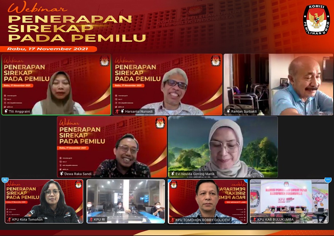 Tomohon, 17 November 2021. KPU Kota Tomohon mengikuti kegiatan Webinar "Penerapan Sirekap Pada Pemilu" yang dilaksanakan oleh KPU RI secara daring, kegiatan dibuka oleh Ketua KPU RI Ilham Saputra dan dilanjutkan penyampaian oleh Anggota KPU RI yang membidangi Divisi Teknis Penyelenggara Evi Novinda Ginting Manik setelah itu masuk dalam materi yang dibawakan langsung oleh Narasumber yaitu Dr. Harsanto Nursadi S.H.,M.Si (Pakar Hukum), Prof.Ramlan Surbakti, MA .,PH.D (Pakar Kepemiluan) dengan moderator Titi Anggraini (Pegiat Pemilu), peserta kegiatan ini diikuti seluruh Komisioner KPU, Kabag dan Kasubbag Teknis Penyelenggara Provinsi dan Kab/Kota seluruh Indonesia.