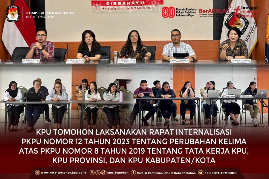 Tomohon, kota-tomohon.kpu.go.id - Komisi Pemilihan Umum (KPU) Kota Tomohon menggelar Rapat Internalisasi Peraturan Komisi Pemilihan Umum (PKPU) Nomor 12 Tahun 2023 tentang Perubahan Kelima atas PKPU Nomor 8 Tahun 2019 tentang Tata Kerja KPU, KPU Provinsi, dan KPU Kabupaten/Kota. Kegiatan ini berlangsung di Aula KPU Kota Tomohon.