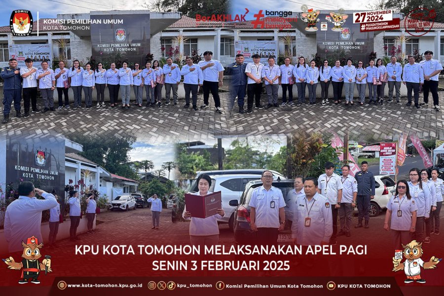 Tomohon, kota-tomohon.kpu.go.id - Pada hari ini Senin, 3 Februari 2025. Sekretaris, Kasubag dan Staf Sekretariat melaksanakan apel pagi rutin bertempat di Halaman Kantor KPU Kota Tomohon. Pembina Apel Sekretaris KPU Kota Tomohon Anita Sofya Tampi, dimulai pukul 08.00 WITA.