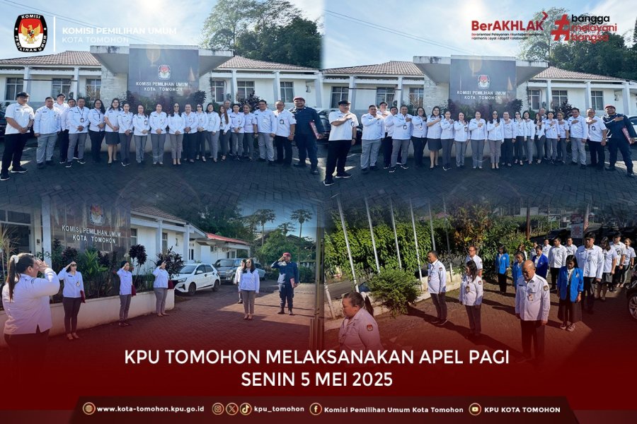 Apel pagi dimulai tepat pukul 08.00 WITA, dihadiri oleh Sekretaris, para Kepala Subbagian dan seluruh Pelaksana serta Mahasiswa yang melaksanakan program Magang di Kantor KPU Kota Tomohon.