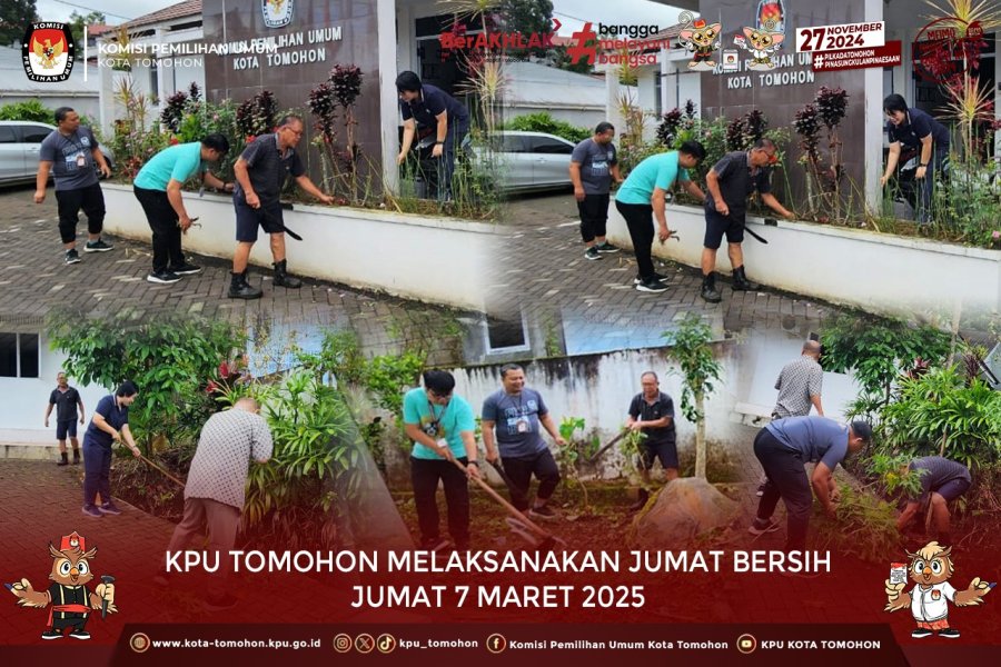 Tomohon, kota-tomohon.kpu.go.id - Menindaklanjuti Surat Sekretaris Jenderal Komisi Pemilihan Umum Nomor 2963/SDM.07.1-SD/04/2023 tanggal 8 Agustus 2023 perihal Pelaksanaan Olahraga pada Hari Jumat serta menindaklanjuti arahan Sekretaris Jenderal Komisi Pemilihan Umum terkait pelaksanaan kegiatan Jumat Bersih selain kegiatan Olahraga pada hari jumat, Sekretariat KPU Kota Tomohon melaksanakan kegiatan Jumat Bersih di halaman kntor KPU Kota Tomohon, Jumat (07/05/2025).