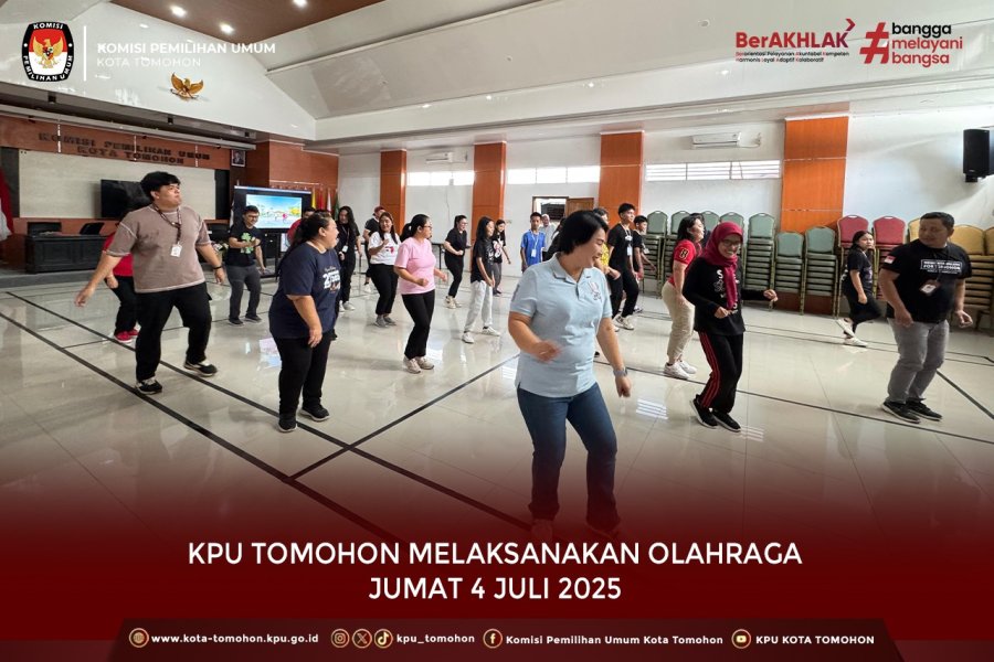 Tomohon, kota-tomohon.kpu.go.id - Dalam rangka menjaga dan meningkatkan kebugaran jajaran Sekretariat KPU Kota Tomohon serta menunjang produktivitas dan optimalisasi kinerja, maka diperlukan upaya untuk menjaga kesehatan dan kebugaran, salah satunya melalui kegiatan Olahraga di aula kantor KPU Tomohon, Jumat (4/7/2025).