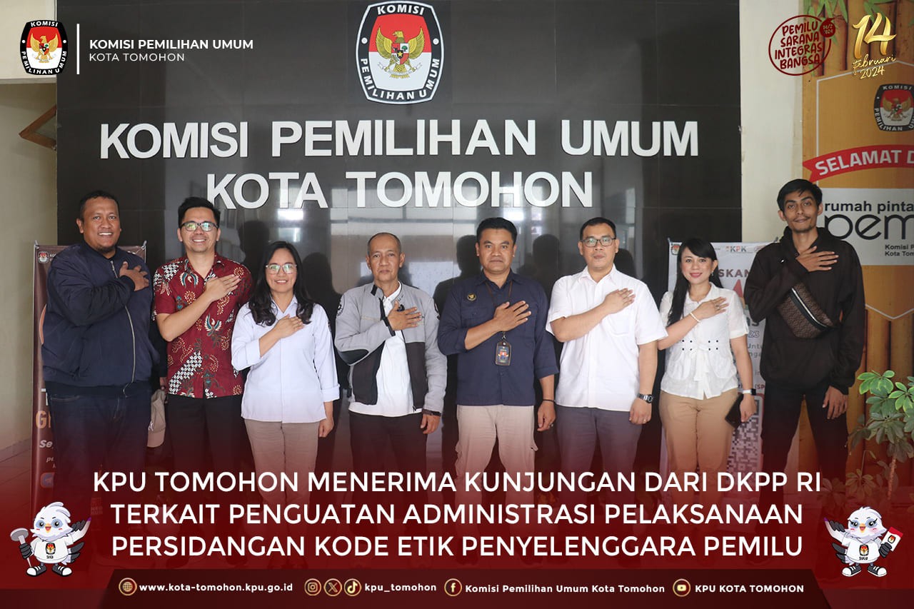 Tomohon, kota-tomohon.kpu.go.id - KPU Kota Tomohon menerima Kunjungan dari Dewan Kehormatan Penyelenggara Pemilihan Umum Republik Indonesia, Senin (13/11/2023). Rombongan DKPP RI disambut langsung oleh Ketua KPU Kota Tomohon Albertien G. V. Pijoh, Anggota Deisy T. Soputan, Youne Y. P. Simangunsong, Rojer R. Datu, Sekretaris Anita S. Tampi serta Para Kasubag.