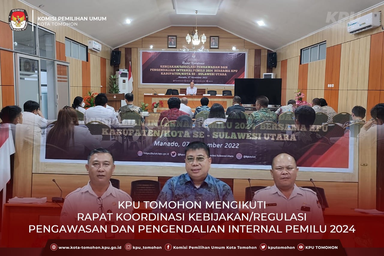 Tomohon, kota-tomohon.kpu.go.id - KPU Kota Tomohon mengikuti Rapat Koordinasi Kebijakan/Regulasi Pengawasan dan Pengendalian Internal Pemilu 2024 yang diselenggarakan oleh KPU Provinsi Sulawesi Utara, bertempat di Aula Kantor KPU Provinsi Sulawesi Utara, Senin (7/11). Rakor diikuti oleh KPU Kabupaten/Kota se Sulut.