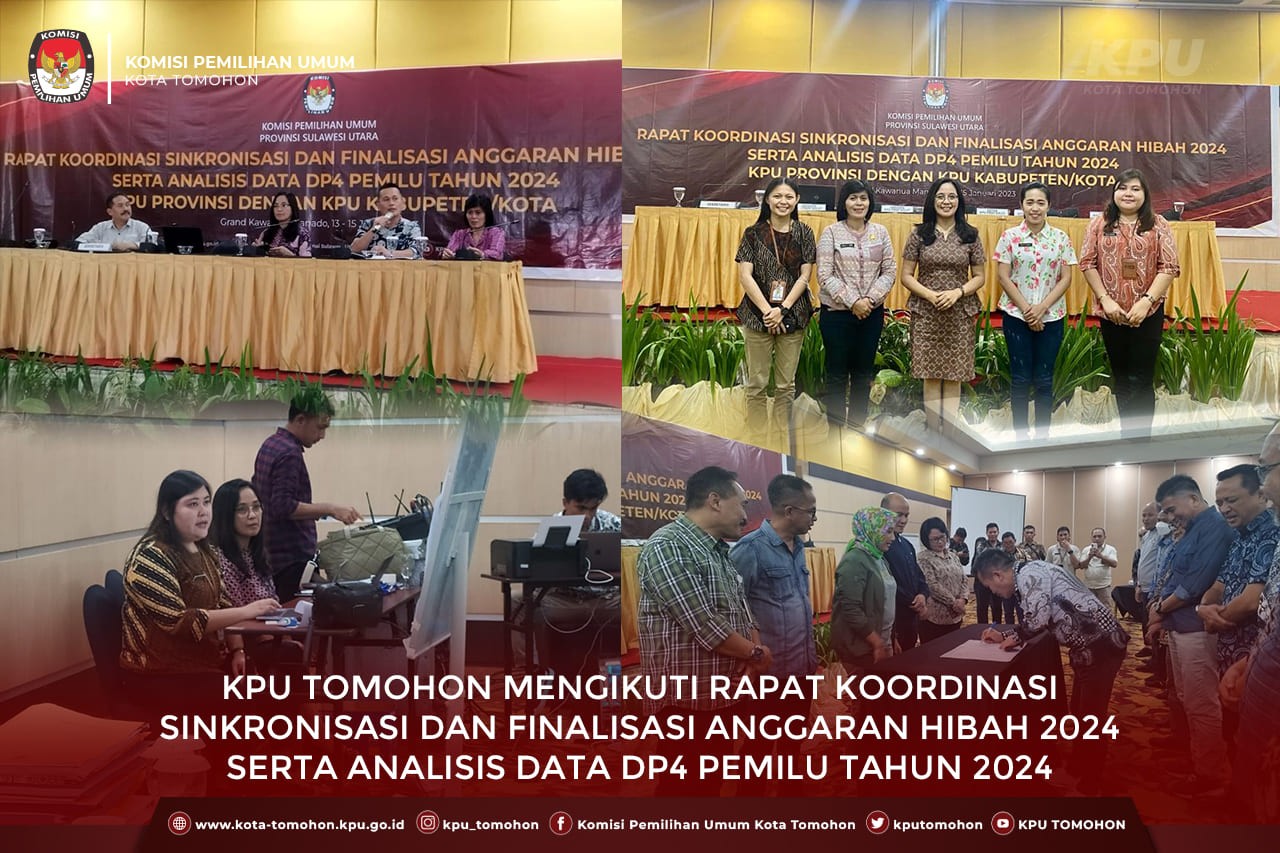 Tomohon, kota-tomohon.kpu.go.id - Ketua, Sekretaris, Kadiv Perencanaan, Data dan Informasi, Kasubbag Perencanaan, Data dan Informasi beserta Operator Sidalih menghadiri Rapat Koordinasi Sinkronisasi dan Finalisasi Anggaran Hibah 2024 serta Analisis Data DP4 Pemilu Tahun 2024, yang diselenggarakan KPU Provinsi Sulawesi Utara, bertempat di Grand Kawanua Hotel Manado. Kegiatan rakor berlangsung selama 3 (tiga) hari, tanggal 13-15 Januari 2023.