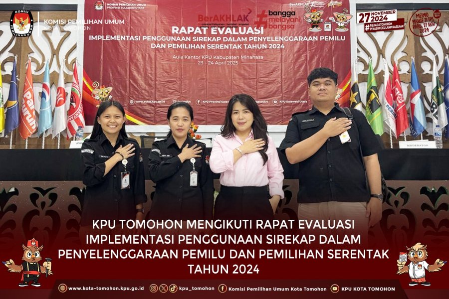 Tomohon, kota-tomohon.kpu.go.id - Ketua Divisi Perencanaan, Data dan Informasi Arinny Y. Poli, Kepala Sub Bagian Hetty M. Kabi bersama Operator Dwiputri R. A. Pusung menghadiri kegiatan Rapat Evaluasi Implementasi Penggunaan Sirekap dalam Penyelenggaraan Pemilu dan Pemilihan Serentak Tahun 2024, yang diselenggarakan oleh KPU Provinsi Sulawesi Utara bertempat di Aula KPU Kabupaten Minahasa yang beralamat di Kompleks Stadion Maesa, Kec. Wewelen, Kec. Tondano Barat, Rabu – Kamis, 23 s.d 24 April 2025.