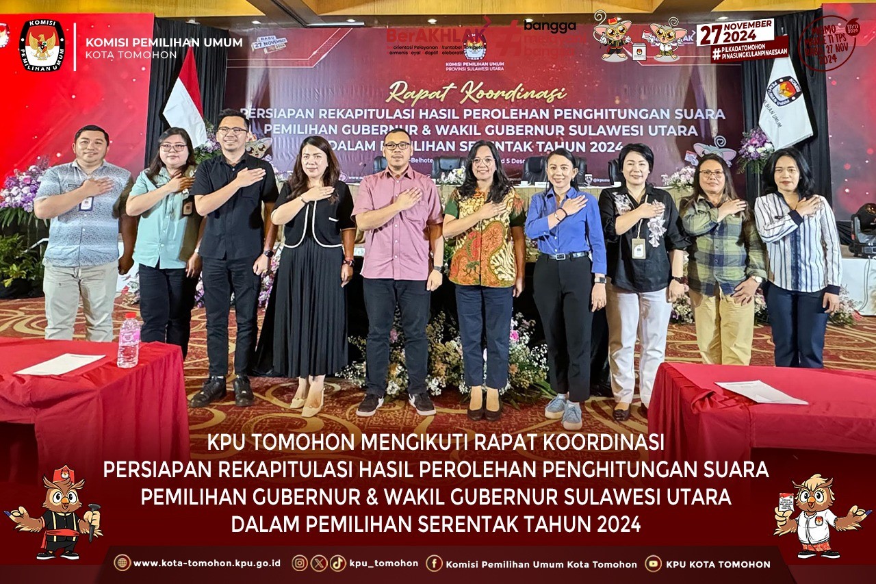 KPU Tomohon Mengikuti Rapat Koordinasi Persiapan Rekapitulasi Hasil Perolehan Penghitungan Suara Pemilihan Gubernur & Wakil Gubernur Provinsi Sulawesi Utara dalam Pemilihan Tahun 2024