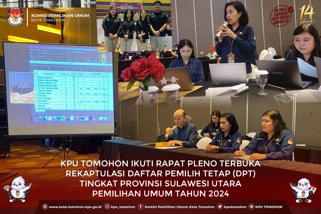 KPU Tomohon Mengikuti Rapat Pleno Terbuka Rekapitulasi Daftar Pemilih Tetap (DPT) Tingkat Provinsi Sulawesi Utara Pemilu Tahun 2024