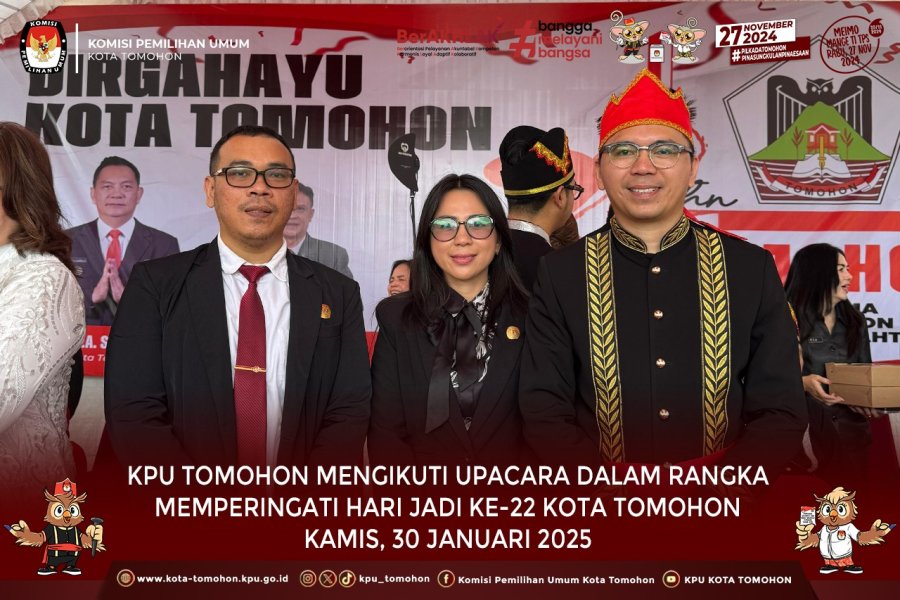 Tomohon, kota-tomohon.kpu.go.id - Anggota KPU Kota Tomohon Rojer R. Datu, Youne Y. P. Simangunsong dan Deisy T. Soputan mengikuti Upacara dalam rangka memperingati Hari Jadi ke-22 Kota Tomohon bertempat di Stadion Babe Palar, Kamis (30/01/2025).