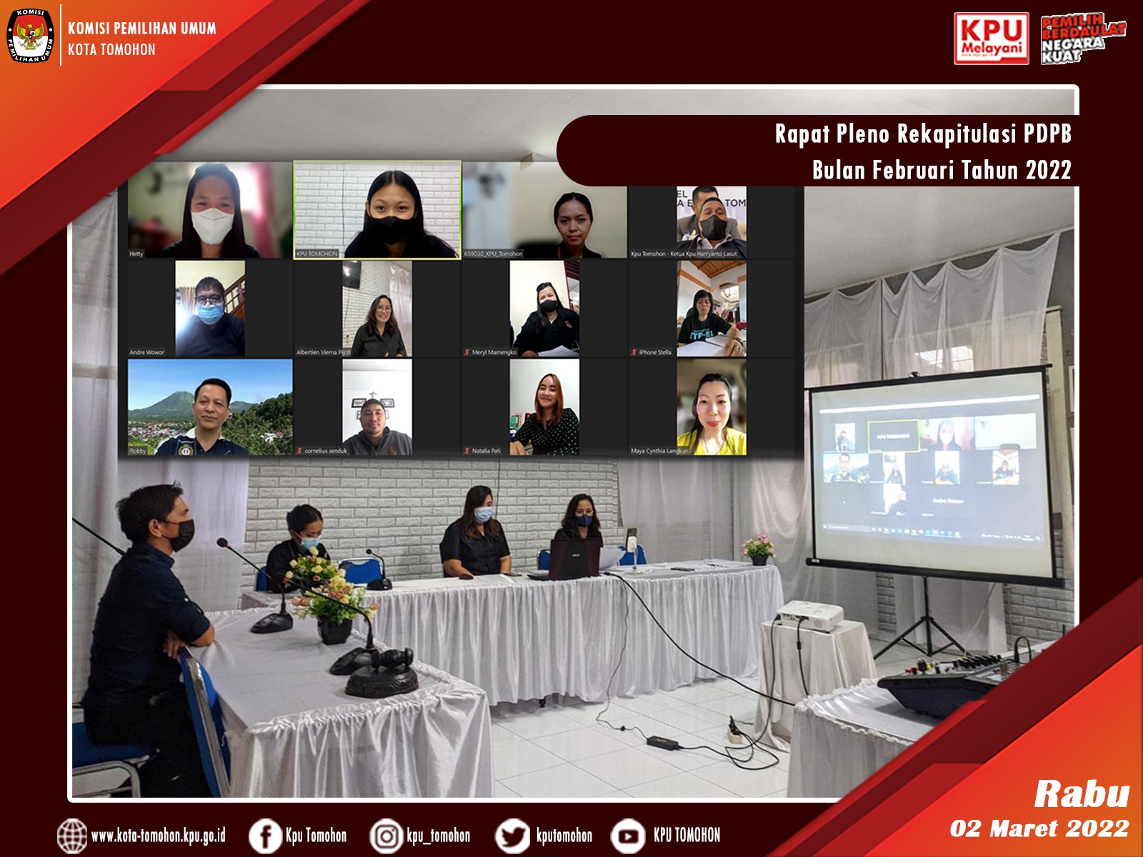 KPU Kota Tomohon melaksanakan Rekapitulasi Daftar Pemilih Berkelanjutan Periode Februari Tahun 2022 secara daring melalui aplikasi Zoom Meeting, Rabu (02/03).