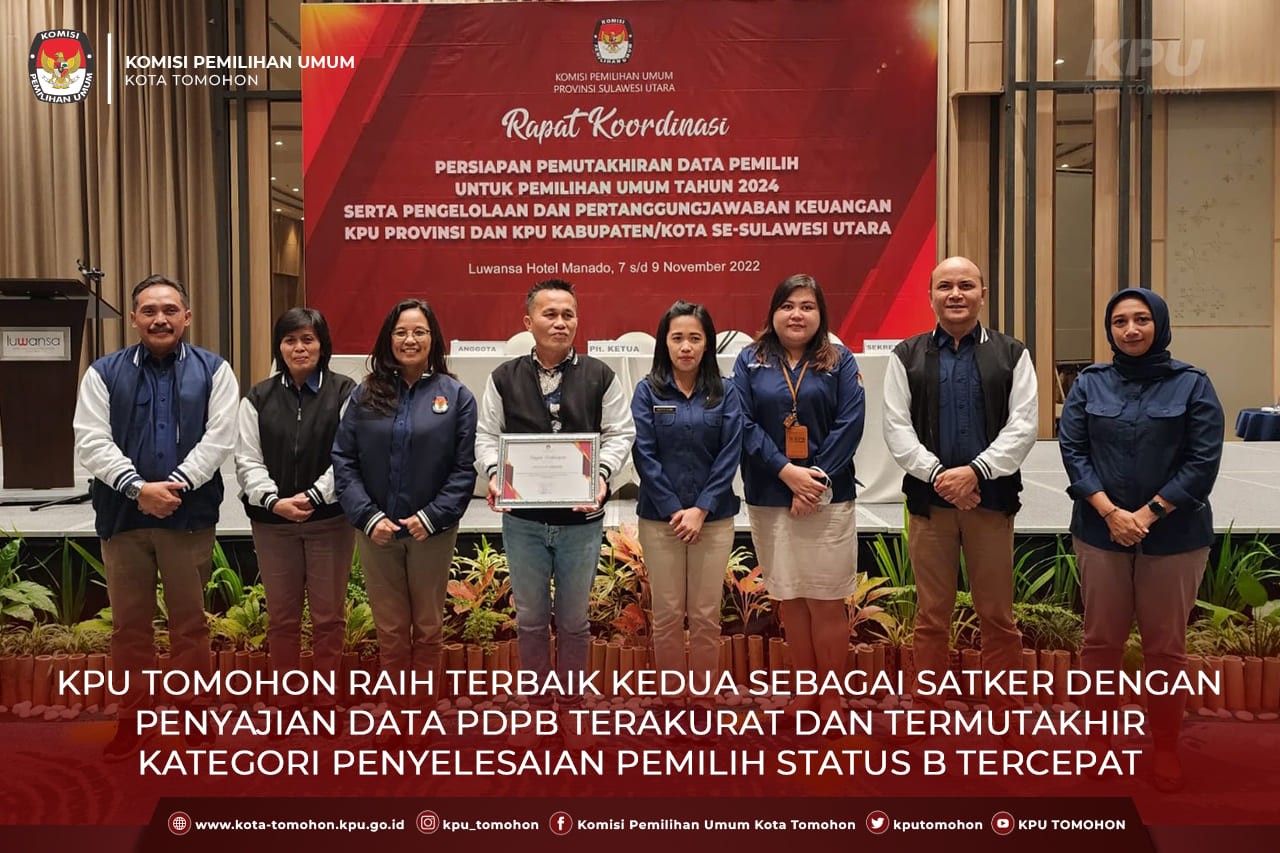 Dalam rakor ini juga KPU Tomohon sendiri meraih Terbaik Kedua Sebagai Satuan Kerja dengan Penyajian Data PDPB Terakurat dan Termutakhir Kategori Penyelesaian Pemilih Status B Tercepat.