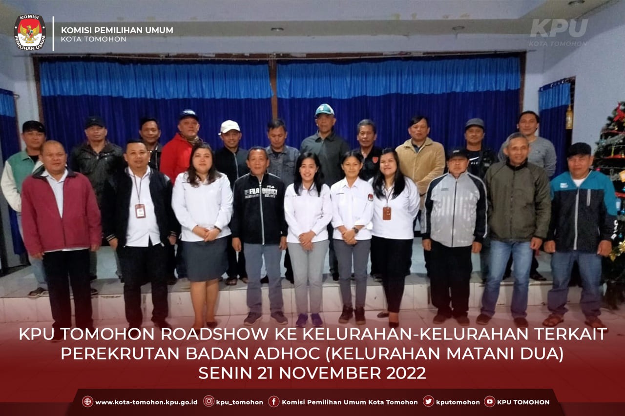 Tomohon, kota-tomohon.kpu.go.id - Sosialisasi ke perangkat Kelurahan Matani Dua, terkait rekrutmen Badan Adhoc (PPK/PPS). Hadir Lurah, Para Kepala Lingkungan dan Wakil Kepala Lingkungan di Kelurahan Matani Dua.