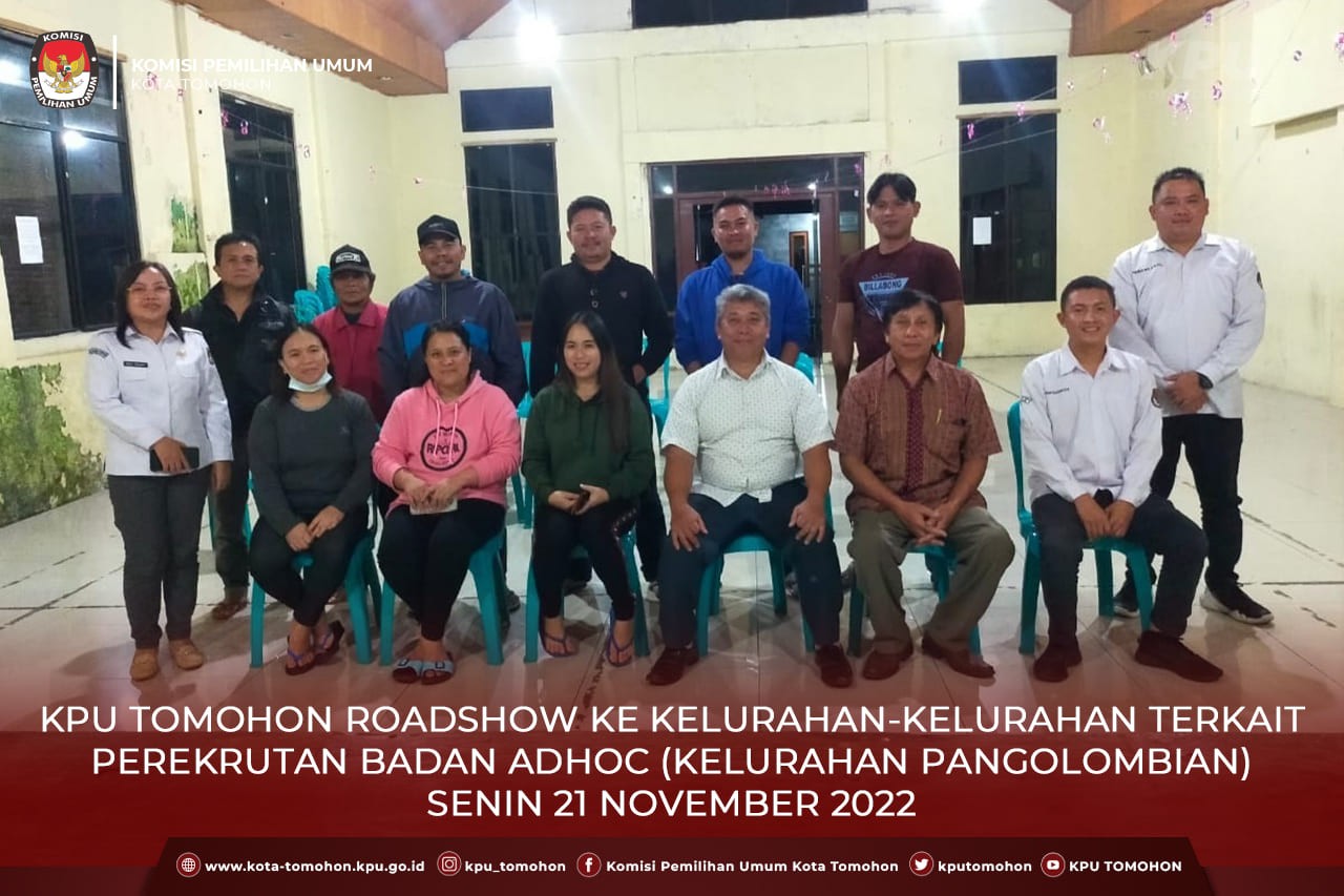 Tomohon, kota-tomohon.kpu.go.id - Sosialisasi ke perangkat Kelurahan Pangolombian, terkait rekrutmen Badan Adhoc (PPK/PPS). Hadir Lurah, Para Kepala Lingkungan dan Wakil Kepala Lingkungan di Kelurahan Pangolombian
