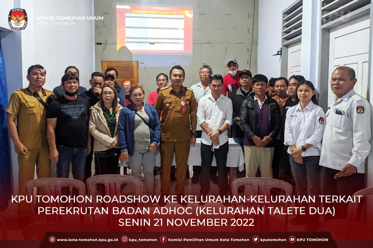 Tomohon, kota-tomohon.kpu.go.id - Sosialisasi ke perangkat Kelurahan Talete Dua, terkait rekrutmen Badan Adhoc (PPK/PPS). Hadir Lurah Aldy Silahoy, Para Kepala Lingkungan dan Wakil Kepala Lingkungan di Kelurahan Talete Dua.