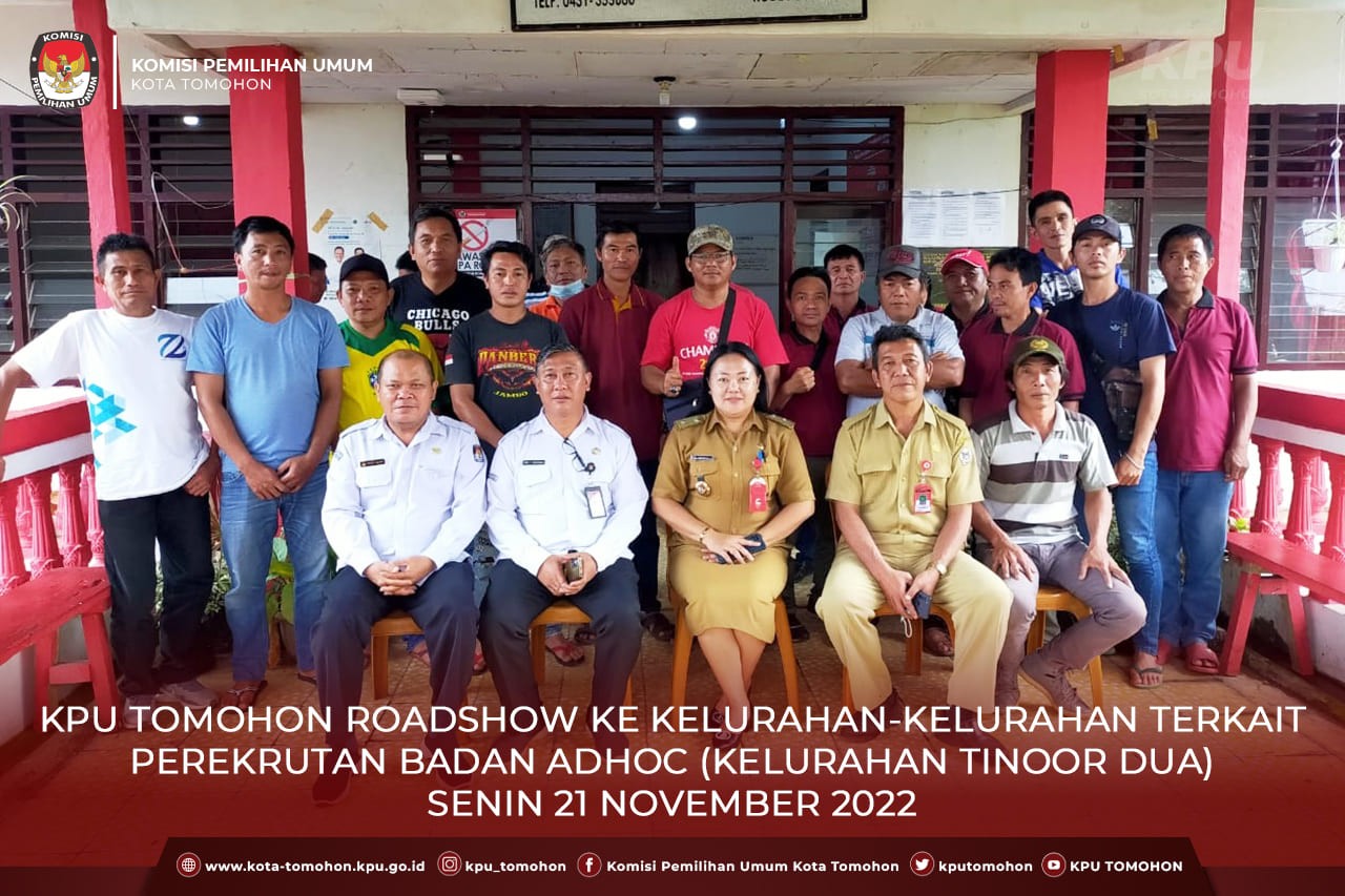 Tomohon, kota-tomohon.kpu.go.id - Sosialisasi ke perangkat Kelurahan Tinoor Dua, terkait rekrutmen Badan Adhoc (PPK/PPS). Hadir Lurah Delvia Mamangkey, Seklur Tenny Rindengan, Para Kepala Lingkungan dan Wakil Kepala Lingkungan di Kelurahan Tinoor Dua.