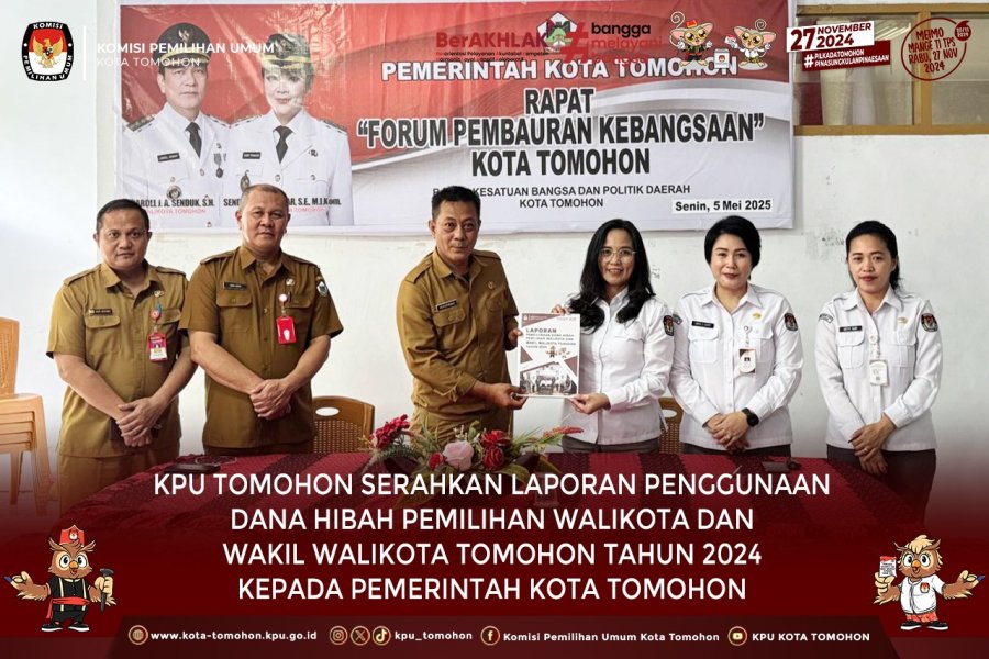 Laporan pertanggungjawaban penggunaan anggaran Pemilihan Walikota dan Wakil Walikota Tomohon Tahun 2024 ini sebagai bentuk pertanggungjawaban penggunaan anggaran hibah yang diberikan Pemerintah Kota Tomohon melalui Badan Kesatuan Bangsa dan Politik.