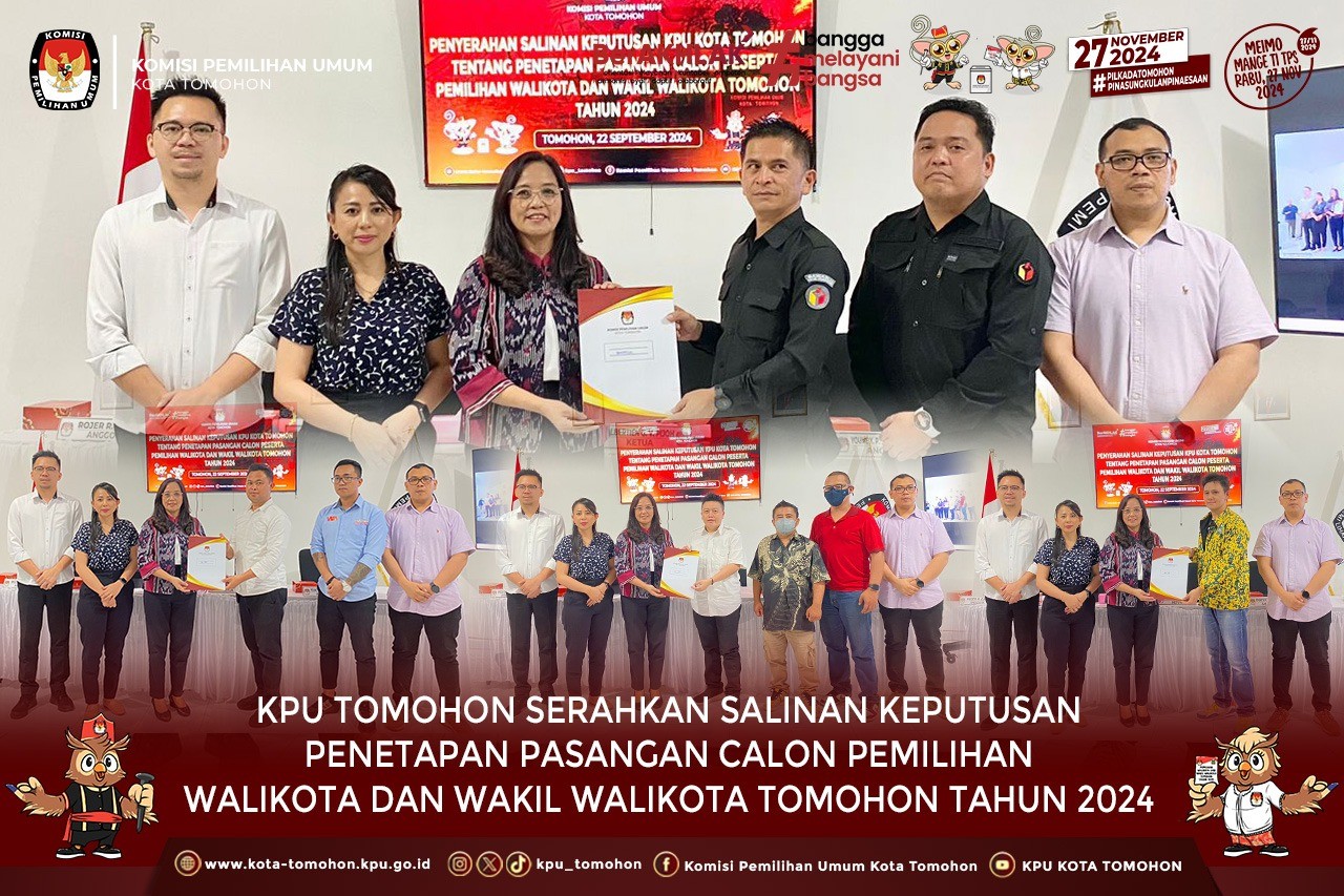 KPU Tomohon Serahkan Salinan Keputusan Penetapan Pasangan Calon Pemilihan Walikota dan Wakil Walikota Tomohon Tahun 2024