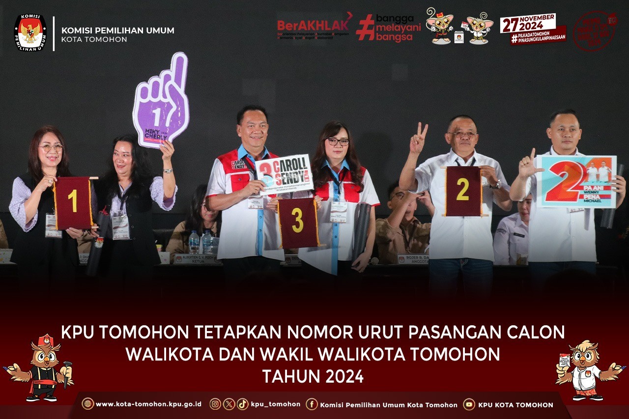 Setelah periode tanggapan masyarakat yang berlangsung dari 15 hingga 18 September, KPU Tomohon melaksanakan pengundian nomor urut pada hari ini. Hasil pengundian menunjukkan bahwa:
