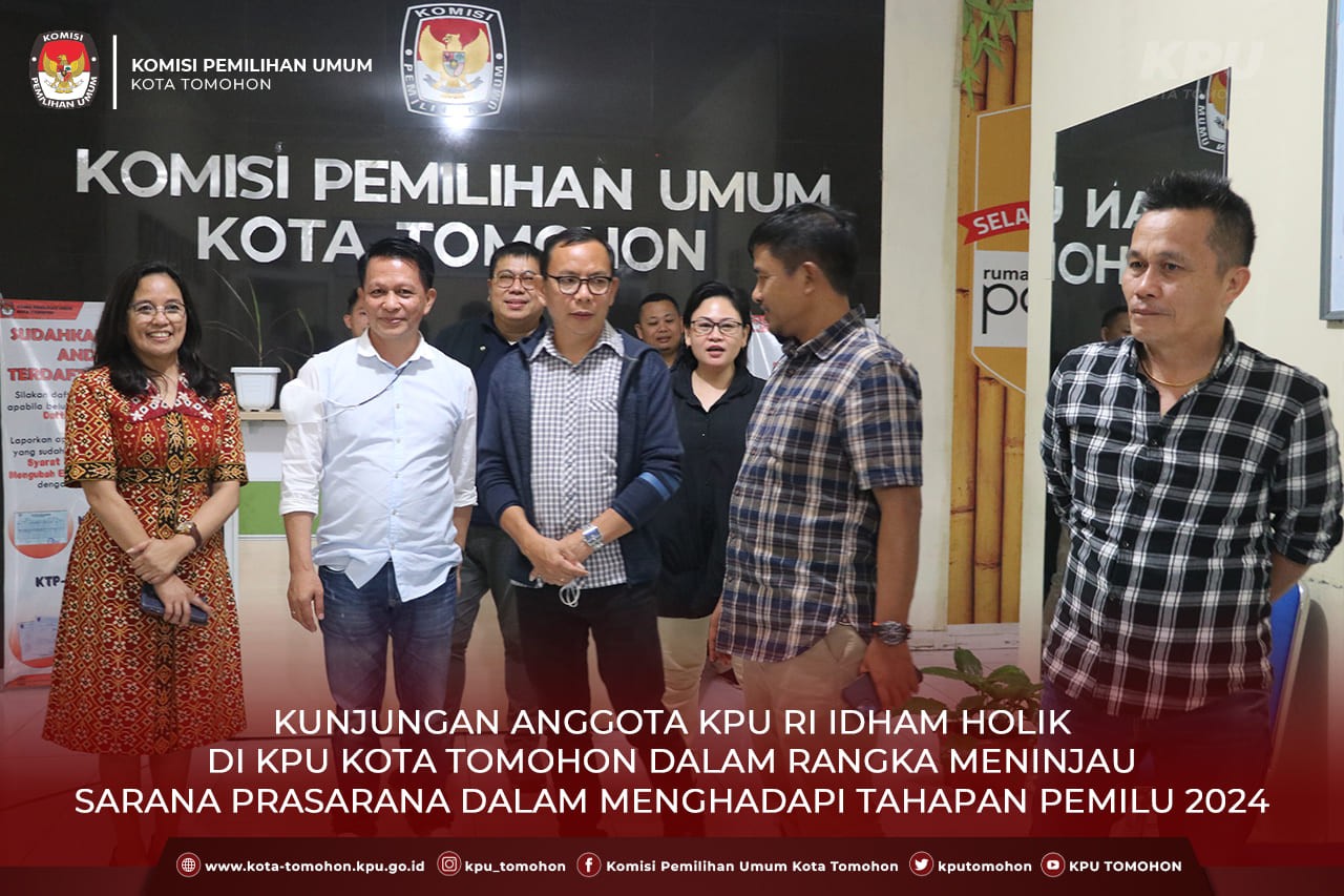 Tomohon, kota-tomohon.kpu.go.id - Anggota KPU Idham Holik didampingi Anggota KPU Provinsi Sulawesi Utara Yessy Momongan melakukan kunjungan kerja ke KPU Kota Tomohon, Jumat (16/9). Idham meninjau langsung sarana dan prasarana kantor serta memastikan kesiapan KPU Kota Tomohon dalam menghadapi proses tahapan Pemilu 2024. Turut hadir Ketua, Anggota, dan Sekretaris KPU Kota Tomohon serta jajaran sekretariat KPU Kota Tomohon.