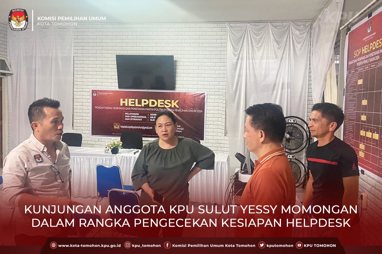 Tomohon, kota-tomohon.kpu.go.id - Anggota KPU Provinsi Sulawesi Utara Yessy Momongan yang juga merupakan Ketua Divisi Teknis Penyelenggara melakukan kunjungan ke KPU Kota Tomohon dalam rangka mengecek kesiapan helpdesk dalam menghadapi Pendaftaran, Verifikasi dan Penetapan Partai Politik Peserta Pemilu, Jumat (12/8).