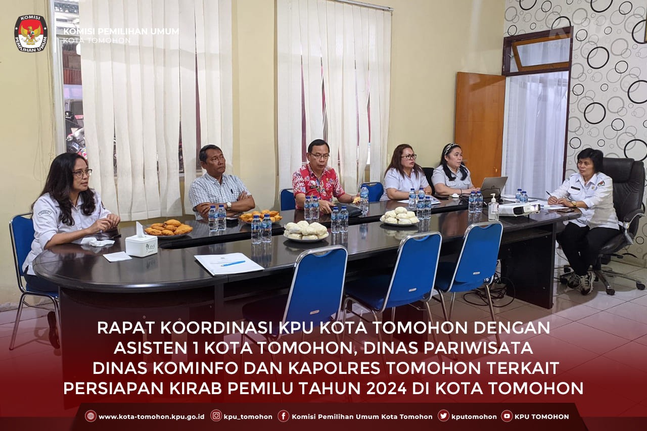 Tomohon, kota-tomohon.kpu.go.id - Menjelang pelaksanaan Kirab Pemilu Tahun 2024 di Kota Tomohon, KPU Kota Tomohon melaksanakan Rapat Koordinasi dengan Asisten 1 Kota Tomohon, Dinas Pariwisata, Dinas Kominfo dan Kapolres terkait persiapan pelaksanaan Kirab Pemilu Tahun 2024 pada 14-19 Maret mendatang.