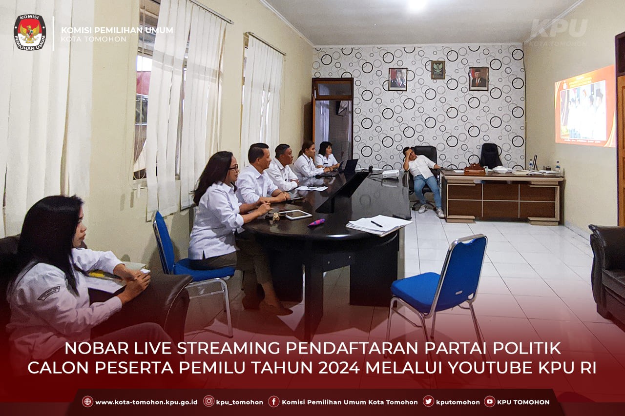 Tomohon, kota-tomohon.kpu.go.id - KPU Kota Tomohon gelar nonton bareng (Nobar) live streaming pendaftaran partai politik calon peserta Pemilu Tahun 2024 melalui Youtube KPU RI, Senin (1/8). KPU RI menerima dokumen persyaratan jika lengkap, dan dari 9 partai politik yang mendaftar hari ini, 6 partai politik dinyatakan lengkap yakni Partai Demokrasi Indonesia Perjuangan (PDI Perjuangan), Partai Keadilan dan Persatuan (PKP), Partai Keadilan Sejahtera (PKS), Partai Persatuan Indonesia (Perindo), Partai NasDem, Partai Bulan Bintang (PBB) dan selebihnya masih dalam proses pemeriksaan.