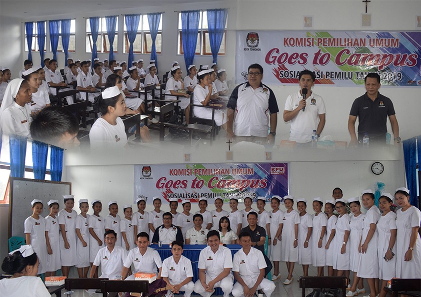 Tomohon, kpu-tomohon.com - Dalam rangkaian kegiatan KPU Goes to Campus 2019, Komisi Pemilihan Umum (KPU) Tomohon memberikan sosialisasi terhadap mahasiswa-i Akper Tomohon, bertempat di Akademi Keperawatan Gunung Maria Tomohon, Rabu, 20 Februari 2019. Adapun pembawa materi sosialisasi dalam kegiatan KPU Goes to Campus 2019 ini, yaitu Komisioner Robby Golioth, ST, Devisi Teknis, Komisioner Stenly Kowaas, ST, Devisi Sosialisasi dan Parmas, dan Komisioner Jacobus A. Wowor, SH, Devisi Hukum, beserta Sekretaris KPU, Noldy Runtu, Spd., Msi., juga para staf sekretariat Kota Tomohon.