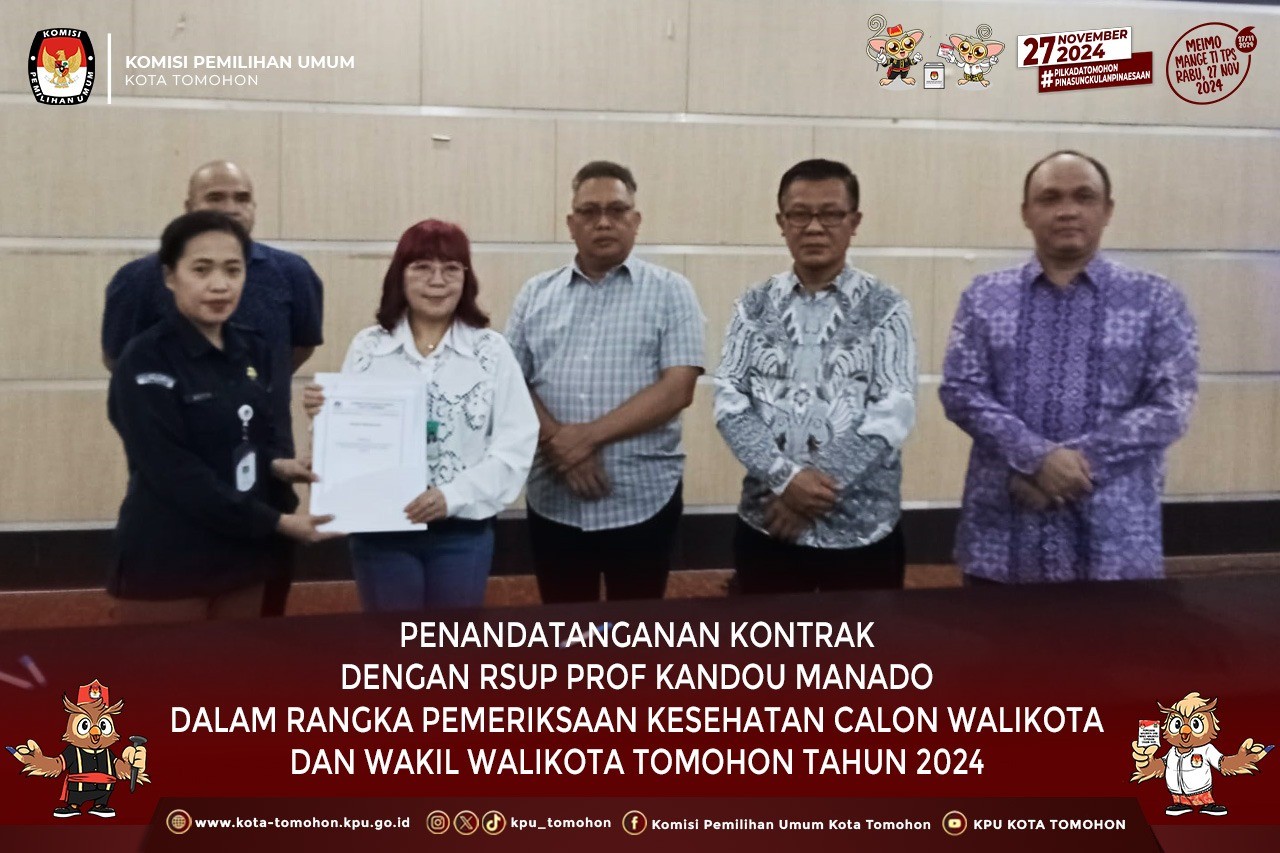 Tomohon, kota-tomohon.kpu.go.id - KPU Kota Tomohon melakukan Penandatanganan Kontrak dengan RSUP Prof Kandou Manado dalam rangka Pemeriksaan Kesehatan Calon Walikota dan Wakil Walikota Tomohon Tahun 2024, di Grand Kawanua Novotel Manado, Sabtu (24/08/2024).
