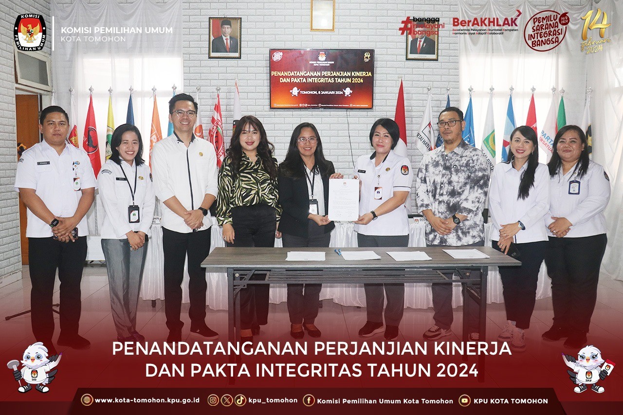 Tomohon, kota-tomohon.kpu.go.id - KPU Kota Tomohon melaksanakan penandatanganan Perjanjian Kinerja dan Pakta Integritas Tahun 2024, bertempat di Kantor KPU Kota Tomohon, Senin (4/1/2024).