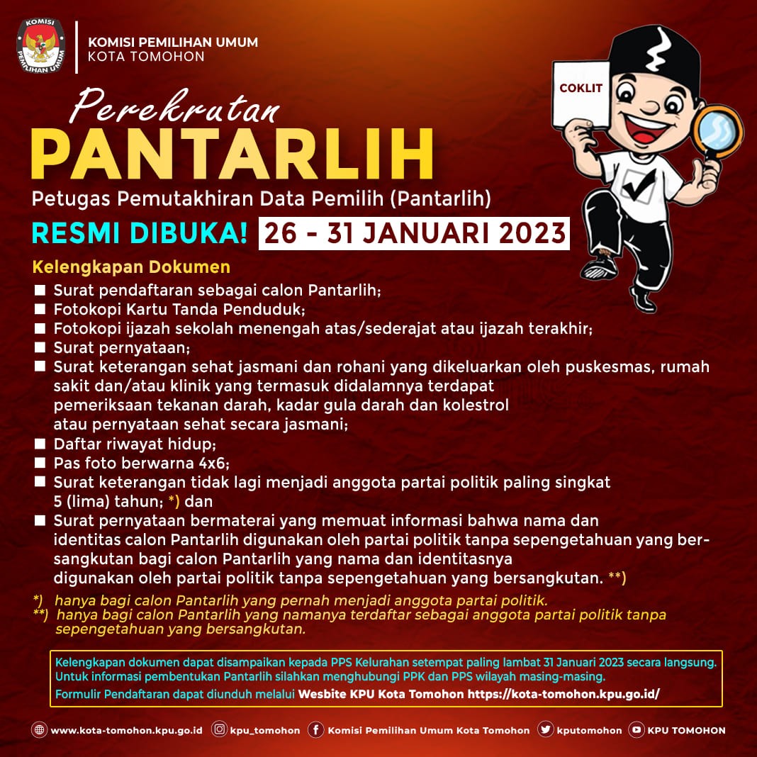 Tahapan Pembentukan Petugas Pemutakhiran Data Pemilih (Pantarlih) untuk Pemilihan Umum Tahun 2024 telah dibuka. Penerimaan Pendaftaran dimulai dari tanggal 26 - 31 Januari 2023. Adapun kelengkapan dokumen yang harus disiapkan untuk pendaftaran Calon Pantarlih: